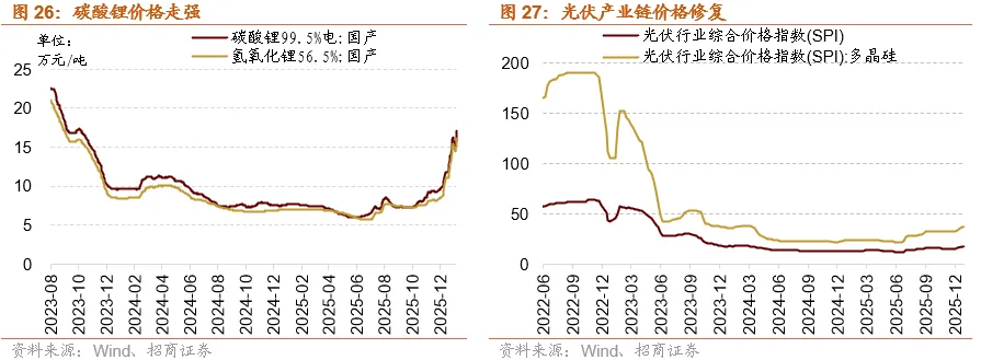 新能源产业链中,受新能源车渗透率提升及储能需求扩张带动,核心材料与电池环节需求保持较高增长,锂原材料价格普遍上涨,碳酸锂月环比涨幅近60%,氢氧化锂价格月环比涨幅超过70%。光伏行业价格指数月环比上行20.24%,受新版光伏行业规范清理低效产能影响和太空光伏等新兴领域需求增长预期,行业延续高景气。
