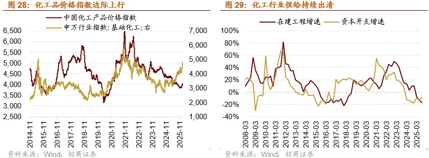 ⚑【基础化工】出口退税取消短期推动抢出口需求提升,中长期促进行业供需格局改善。1)反内卷背景下,行业供给持续出清,25Q3在建工程同比降幅扩大至-17.6%,资本开支延续负增为-8.3%;2)下游光伏以及草铵膦、聚醚多元醇等出口退税政策调整,抢出口需求叠加成本支撑推动短期价格多数上涨;3)出口退税政策中长期倒逼行业落后产能出清,叠加反内卷政策持续推进,行业供需格局有望持续优化;4)细分领域中,近期有机硅大厂连续提价,农药短期或迎来抢出口高峰,氟化工受益于配额政策,产能受限,价格较为强势。