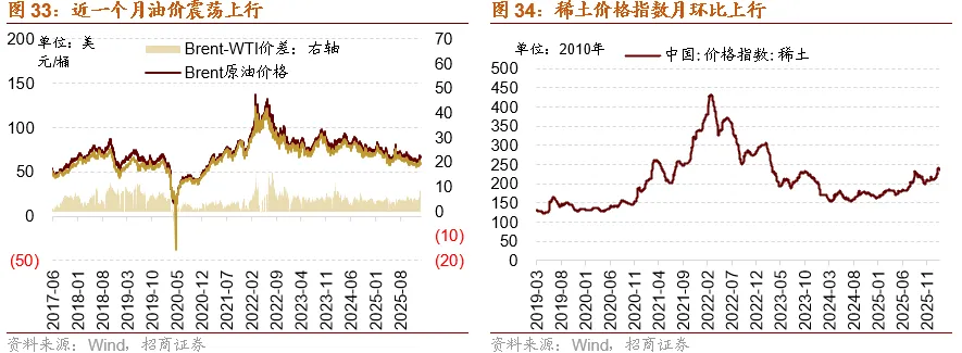 石油化工:近一个月原油价格震荡上行,主要因为美委军事行动以及美国对伊朗威胁言论等推升地缘风险溢价。基于油价上涨推升化工行业成本,以及下游出口补贴政策调整,“抢出口”推动需求提升,多数化工品价格上涨,苯乙烯、苯酐、丁二烯等价格月涨幅居前,有机硅大厂连续提价,后续伴随旺季到来,需求改善,行业价格有望继续修复。