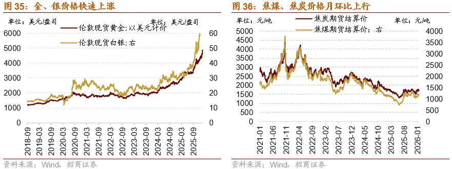 1)部分涨价商品:四季度以来CPI、PPI延续回暖态势,全球流动性改善、下游储能等新兴领域需求改善,叠加反内卷背景下,部分品类供应收缩,推动部分商品价格同环比均明显抬升,企业盈利空间有望修复,典型的如有色(工业金属、能源金属、贵金属)、电池、冶钢原料、非金属材料Ⅱ、化学制品、金属新材料等;