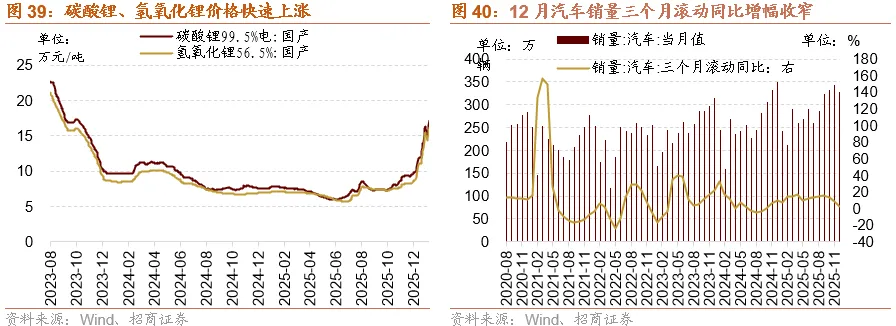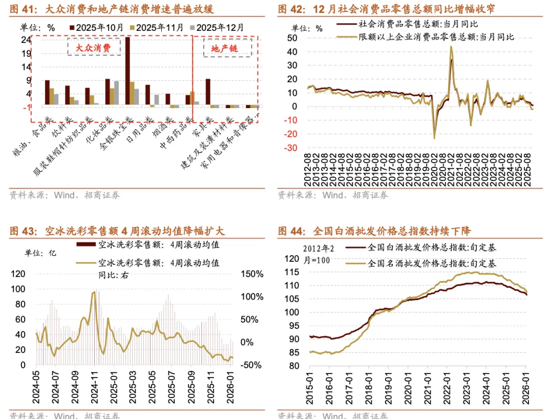 12月经济增长较为平稳,新旧动能持续分化。结构上:1)生产端和价格端均有所恢复,中高端制造业保持较高工业增加值增速,资源品及医药制造业生产端增速改善,随着旺季到来,消费品制造业工业增加值和价格均低位修复;同时随着反内卷的推进,工业企业产能利用率低位回升;2)投资端相对偏弱,基建投资增速出现自2021年11月以来首次转负;3)内需消费恢复承压,12月社零同比增速放缓至年内低位;4)出口较为稳健,尤其高附加值产业高新技术产品、汽车、集成电路等增速较高。