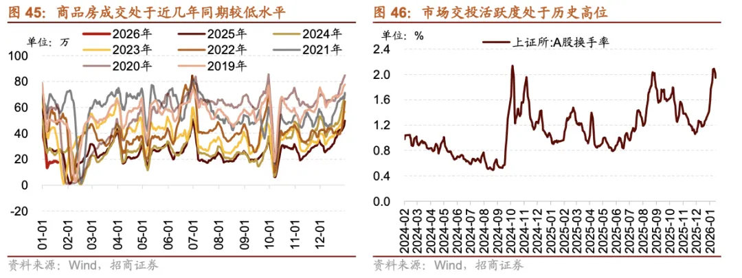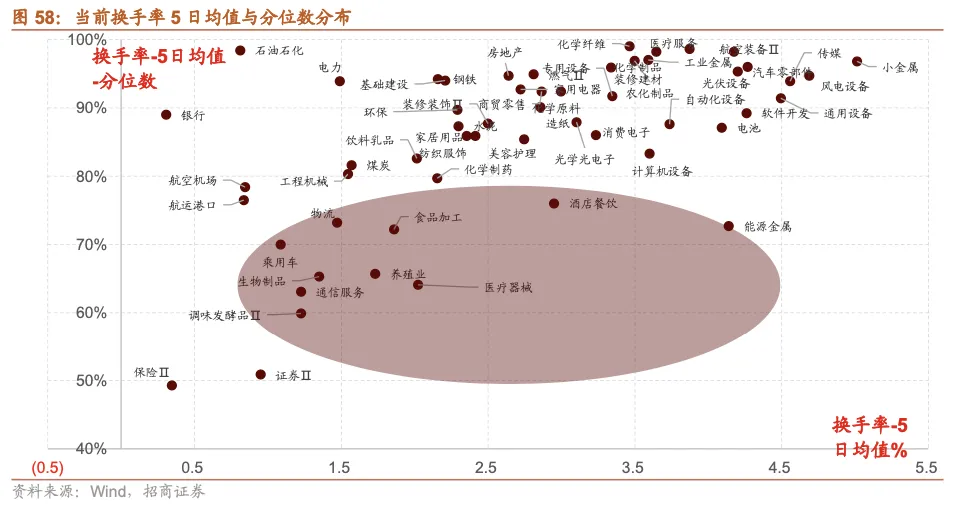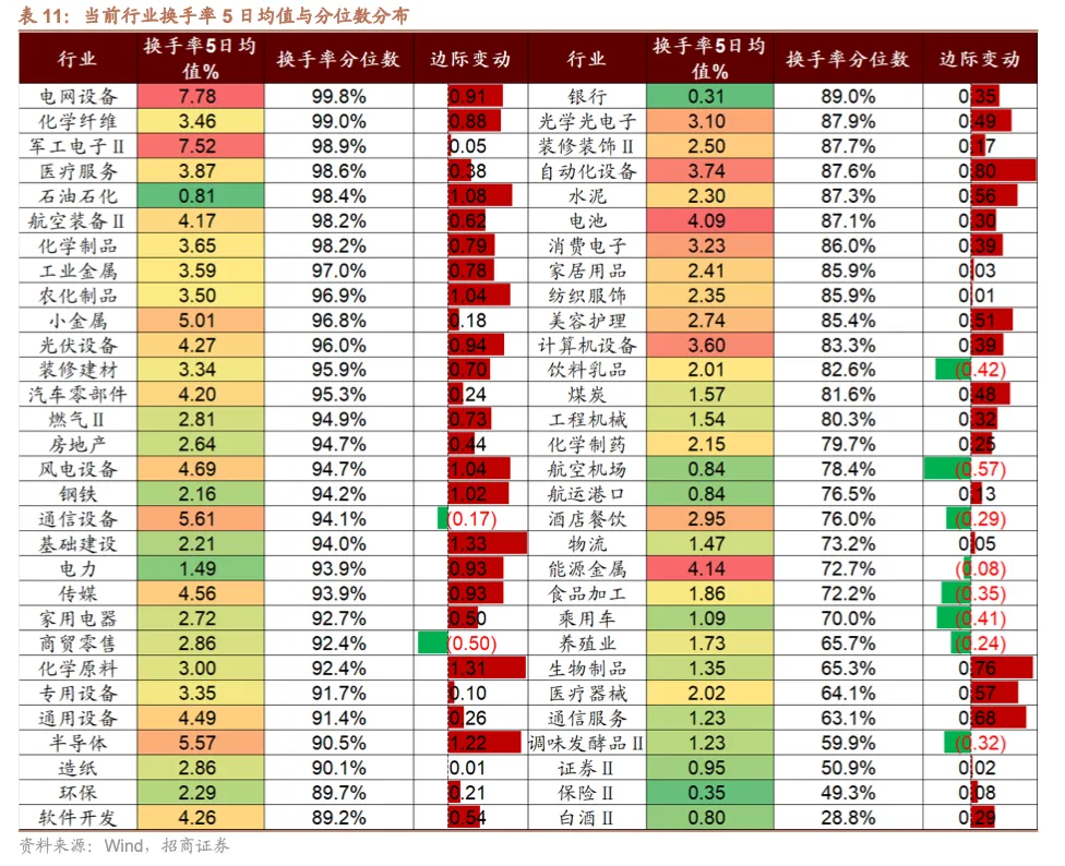 近期市场成交热度明显提升。科技成长和部分涨价品种换手率回升至较高水平,其中传媒、航空装备、工业金属、汽车零部件、风电设备等处于近五年95%以上水平。保险、证券、调味品、通信服务等换手率相对较低。