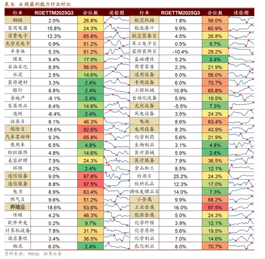 ⚑ 【盈利能力】在“反内卷”等政策的推动下,多数行业供需格局持续优化,价格改善推动整体A股三季报收入和盈利端均改善。大类行业中资源品、信息科技、金融地产盈利改善,信息技术盈利增速领先;25Q3单季度增速:信息科技>金融地产>资源品>公用事业>中游制造>医疗保健>消费服务。上游资源品盈利增速转正,ROE边际上行;中游制造业单季度盈利同比增幅收窄,军工、光伏设备、电池、商用车等盈利改善。消费服务盈利单季度增速降幅扩大,ROE持续下降,小家电、黑色家电、化妆品、个护用品等少数行业盈利改善;医药板块单季度盈利增速转负;TMT盈利增速领先,电子、传媒增速较高;公用事业单季度盈利同比由负转正;金融地产单季度利润增幅扩大,非银增幅扩大,地产跌幅扩大。