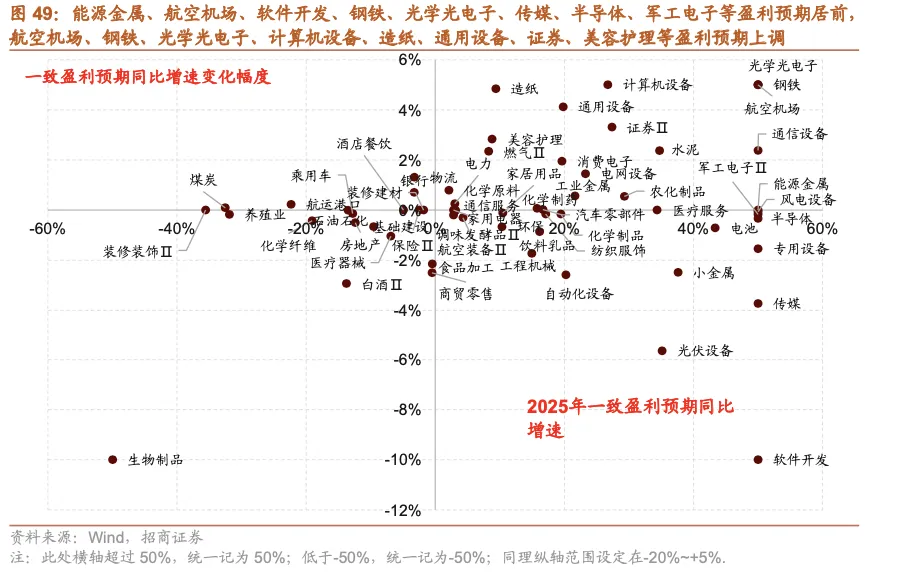 2)中高端制造业:新能源及中高端制造业受益于政策支持和需求回暖双轮驱动,其中AI模型迭代拉动电力需求,海外电网升级需求旺盛,新能源车渗透率稳步提升,新能源产业链量价齐升,电网设备有望延续高增,光伏设备、电池盈利有望改善;军工订单延续回暖,叠加地缘政治风险加剧背景下军贸加速突破,军工电子、地面兵装等行业盈利修复确定性较强;制造业升级和“两新”政策提振需求,机械设备出口稳健增长,汽车出口同比增幅持续扩大,产业端人形机器人量产提速,通用设备、专用设备、自动化设备、乘用车、汽车零部件、家电零部件行业盈利有望改善。