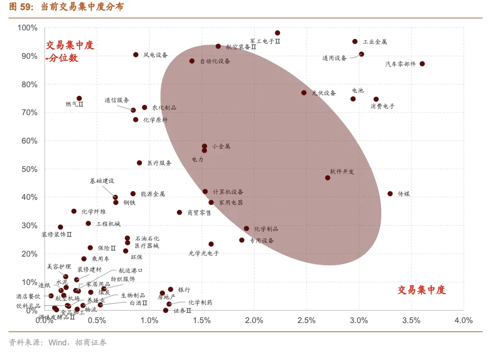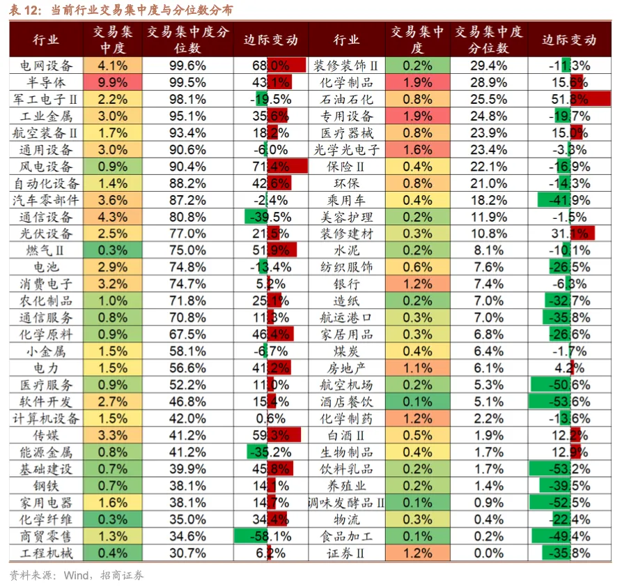 近期随着市场风格的变化,行业交易集中度分化明显下降。当前交易集中度较高的行业主要有工业金属、通用设备、汽车零部件、光伏设备、电池、军工电子等。