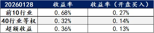 持有上日前10行业,本日收益率为0.68%,行业平均为0.32%,超额收益为0.36%。