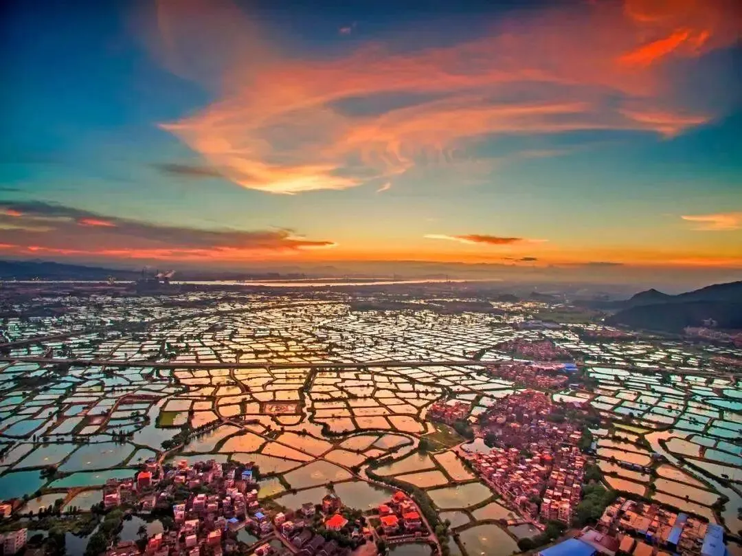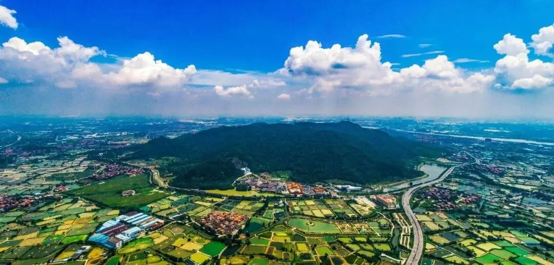 在西樵山鸡冠峰可俯瞰万亩桑基鱼塘。