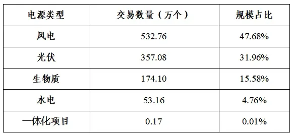 从不同电源类型绿证交易规模情况看,广州电力交易中心平台风电项目交易数量最多,交易规模为532.76万个,占交易总量的47.68%,环比上升128.4%。光伏项目绿证交易规模次之,交易规模为357.08万个,占交易总量31.96%,环比下降40.2%。