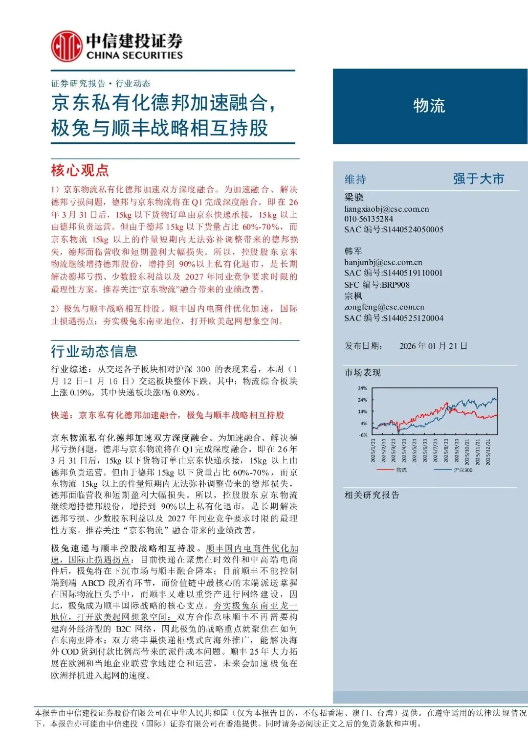 物流行业:京东私有化德邦加速融合,极兔与顺丰战略相互持股-260121-中信建投-16页