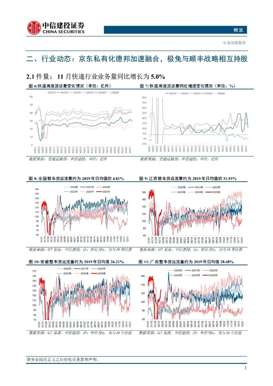 1)京东物流私有化德邦加速双方深度融合。为加速融合、解决德邦亏损问题,德邦与京东物流将在 Q1 完成深度融合。即在 26年 3 月 31 日后,15kg 以下货物订单由京东快递承接,15kg 以上由德邦负责运营。但由于德邦 15kg 以下货量占比 60%-70%,而京东物流 15kg 以上的件量短期内无法弥补调整带来的德邦损