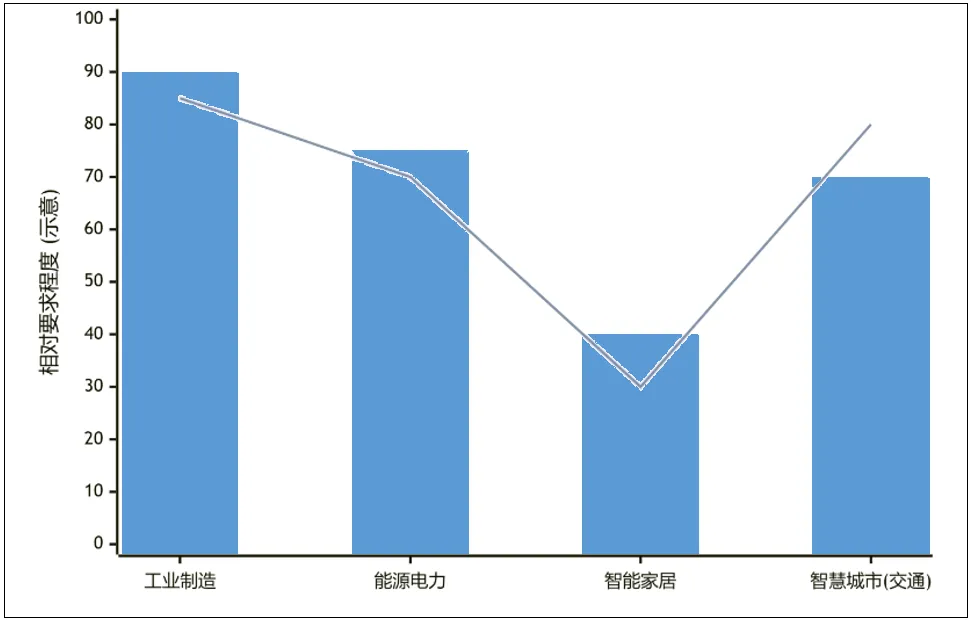 图表简要示意了不同应用场景对智能网关数据流量(柱状)和响应实时性(折线)的差异化要求。工业制造和智慧城市中的交通管理对实时性要求极高,而智能家居场景的数据流量和实时性要求相对较低。