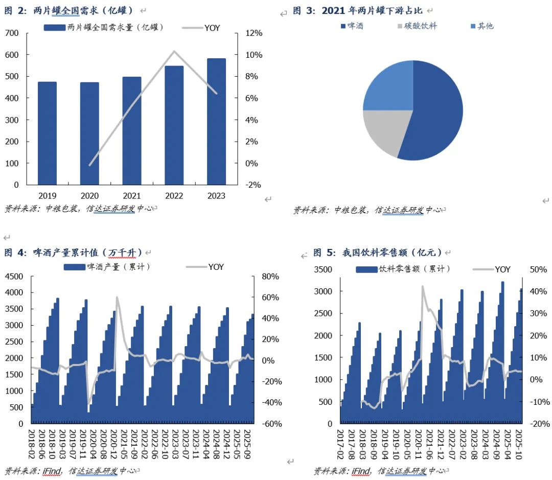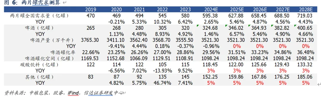 下游消费需求不及预期。金属包装下游为啤酒、碳酸饮料、功能饮料、蛋白饮料等消费品行业,若下游需求疲弱,或会对金属包装需求造成一定影响。