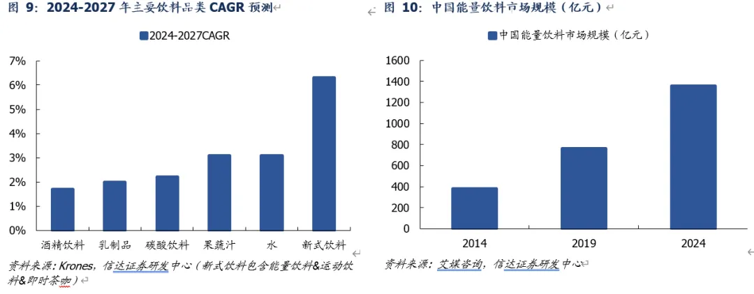1)能量饮料:发展前景乐观,包装价格稳定。伴随居民健康意识、消费水平提高及生活节奏加快,能量饮料消费人群及场景持续扩容,我国能量饮料市场规模2014-24年从381.0亿元已增长至1358.1亿元(CAGR高达13.6%)。根据Krones年报,2024-27年new drinks(含能量饮料&运动饮料&即时茶咖)市场规模CAGR高达6.3%,优于其余所有饮料品类。能量饮料赛道中,红牛主要包材为三片罐,其由于商标事件影响&竞争加剧,红牛市场份额已由2015年的57.2%缩减至2020年的41.2%,我们预计未来销量整体平稳,且其对包装定价稳定,通过原材料下行周期中,奥瑞金&昇兴可享成本红利。