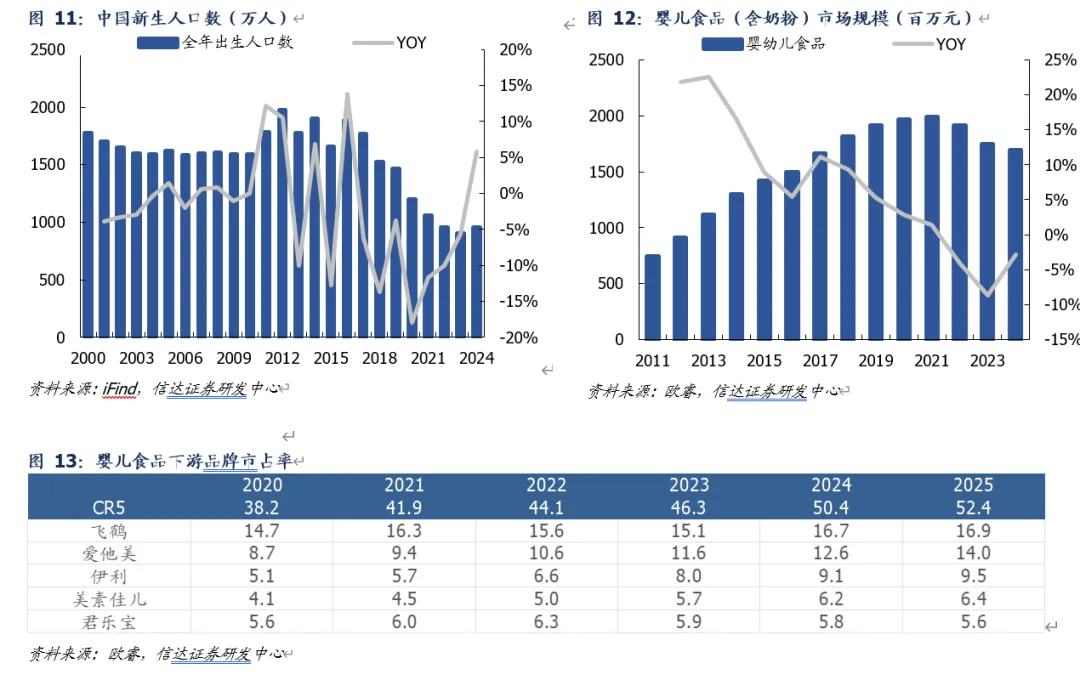 2)婴配奶粉:规模高位下滑,品牌集中度提升利好核心共供应商。受制于我国出生人口数量逐年递减,婴幼儿食品(含奶粉)市场规模在2021年达到顶峰1995亿元后逐步下滑,2024年为1696亿元(21-24CAGR为-5.3%)。龙头品牌依托自身新品研发能力以及产品力持续抢占份额,品牌CR5自2020年38.2%提升至2025年52.4%。昇兴、奥瑞金等核心包装厂深度绑定客户,未来凭借下游格局持续集中、需求有望维持稳健。