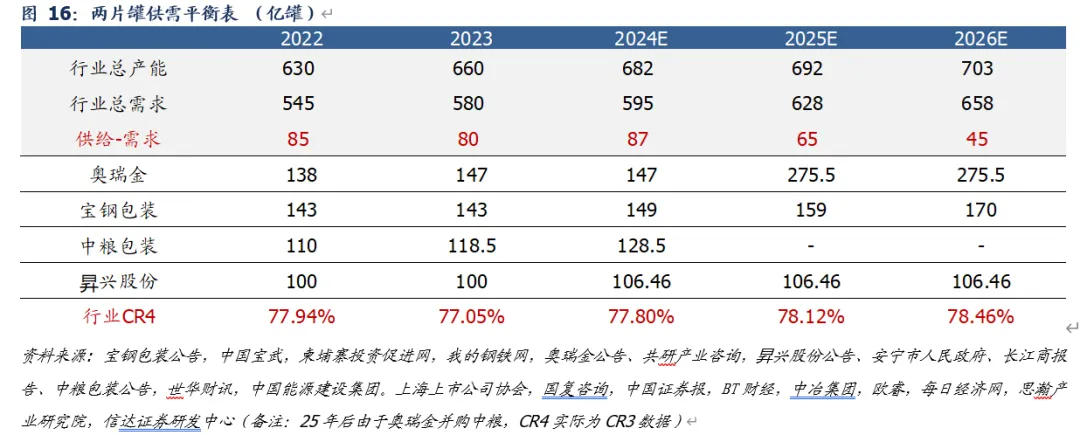 两片罐:格局优化,供需压力缓解。根据我们测算,2023年两片罐CR4高达77%,龙头通常具备更强融资能力及规模效应,通过激进的并购扩张及持续产能投放,行业集中度不断提升;2025年伴随奥瑞金并购中粮落地,行业CR3提升至78%。供需方面,行业近年来持续呈现产能过剩态势,但由于竞争激烈&盈利承压,龙头扩张步伐明显放缓,26年仅有宝钢厦门11亿罐新增产能落地,且未来龙头新增产能规划有限,供需压力有望持续释放。
