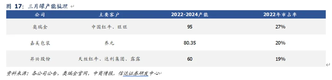 三片罐:扩产有限,行业格局稳定。根据智研咨询,三片罐行业头部企业为奥瑞金、嘉美包装、昇兴股份、吉源、福贞,2022年CR3约为66%,其中奥瑞金市占率约27%、位居行业第一,嘉美市占率约为20%,昇兴市占率约为19%,由于下游需求稳定、三片罐制造端与客户深度绑定且扩产有限,我们判断整体集中度保持稳定。
