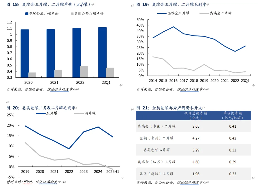 三片客户粘性更强,盈利表现更优。二片罐SKU相对单一、规格简单,标准化程度较强,因此价格为客户重要考虑因素(季度招标);三片罐产品本身易加工&印刷效果好,容量&型号根据客户需求定制,客户更关注供应稳定性,因此粘性更强(通常为年度定价)。此外,金属包装本身资本开支较重(每10亿罐产能需固定投资约3-4亿元),且一旦投产即对开工率有较高要求,因此降价格、保开工为常见策略;二片罐近年投产节奏明显快于三片罐,因此为保障高开工率、龙头价格竞争更为激烈,因此三片罐毛利率明显优于两片罐。
