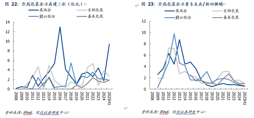 资本开支周期:高点向下,未来产能扩张有限。自1985年我国开始铝制二片罐制造,行业产能持续扩张;伴随2009年开始王老吉逐步将三片罐改为二片罐,基于对二片罐行业前景的一致看好,11-13年国内外金属包装企业纷纷加码二片罐市场,14-15年新建产能集中投产,而后全国二片罐供需出现严重失衡、价格战激烈。此后产能逐步消化,22年迎新一轮扩产,23年各企业扩产意愿明显下降,24-25年行业扩产明显放缓(奥瑞金在建工程25年显著增加主要系增加泰国和哈萨克斯坦等海外基地扩张、国内资本开支显著减少),未来行业盈利有望伴随供给端扩产意愿下降而逐渐修复。