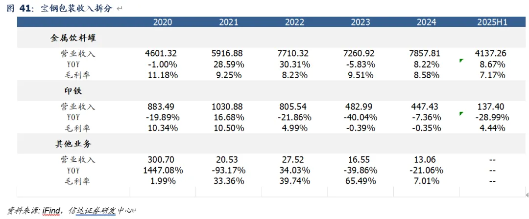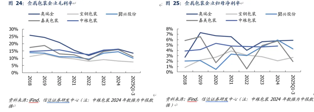 深耕两片罐,盈利中枢有望向上。公司是国内专业从事生产食品、饮料等快速消费品金属包装的领先企业,产品包括金属两片罐及配套易拉盖、包装印铁产品和新材料包装等,是国内快速消费品高端金属包装领域的领导者和行业标准制定者之一,已与可口可乐、百事可乐、雪花啤酒、百威啤酒、嘉士伯啤酒、青岛啤酒、王老吉等国内外知名快消品牌客户成功建立长期稳定的战略合作关系。2020-2024年公司营业收入从57.9亿元增长至83.2亿元(CAGR为9.5%),归母净利润从1.6亿元增长至1.7亿元(CAGR为2.1%);25Q1-3收入/归母净利润同比分别+6.8%/+12.0%。25H1公司金属饮料罐、印铁业务收入分别为41.37亿元(同比+8.7%)、1.37亿元(同比-29.0%),毛利率分别为7.2%、4.4%;金属饮料罐主要为两片罐,25H1收入占比高达96.8%、毛利润占比为98.0%。我们预计未来伴随海外产能占比提升&两片罐行业基准价格提升,盈利中枢有望持续向上。