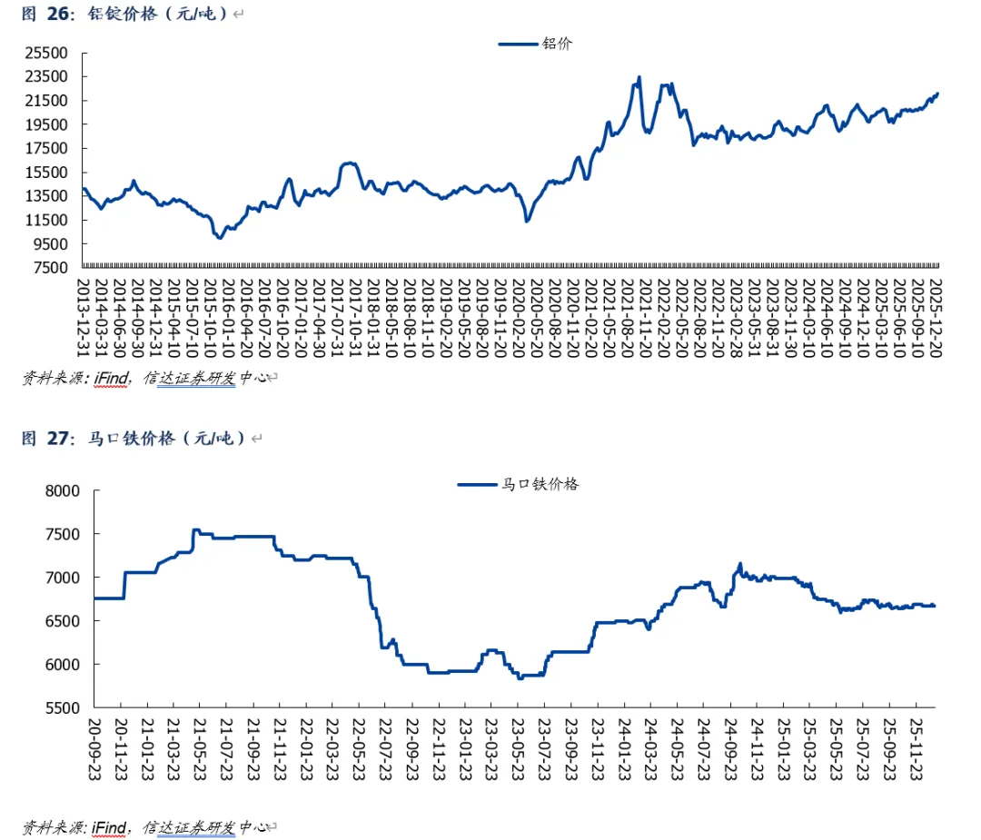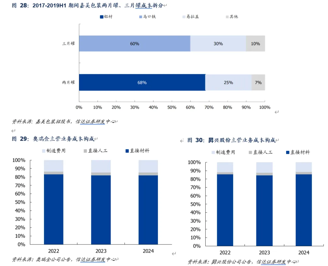 原材料周期:历史较高水平,边际影响预计减弱。原材料成本为金属包装主要成本(原材料成本占比在80%以上),其中铝材为二片罐主要原材料,马口铁为三片罐主要原材料。2025Q2以来,反内卷+美国降息背景下,铝材价格再次迎来上涨,马口铁价格整体表现平稳。展望未来,大宗商品受益于降息周期、26年价格有望保持坚挺,但高斜率增长概率有限,平稳状态下金属包装企业可通过季度调价机制传导成本压力。