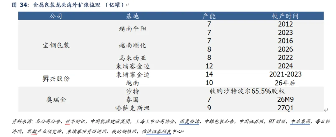 1)宝钢包装:公司于2011年在越南建厂,成为国内首家海外建厂的金属包装企业。目前已在越南平阳和顺化、马来西亚、柬埔寨共计投资建设49亿罐/年的二片罐产能。