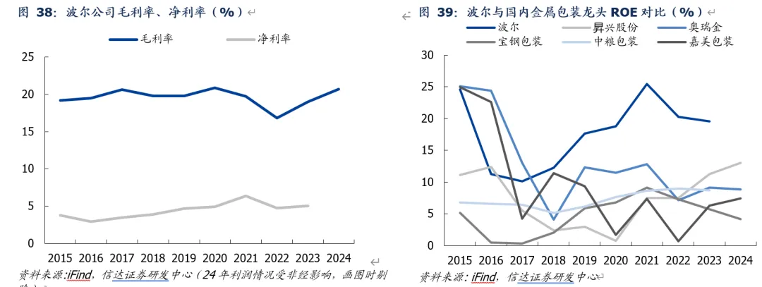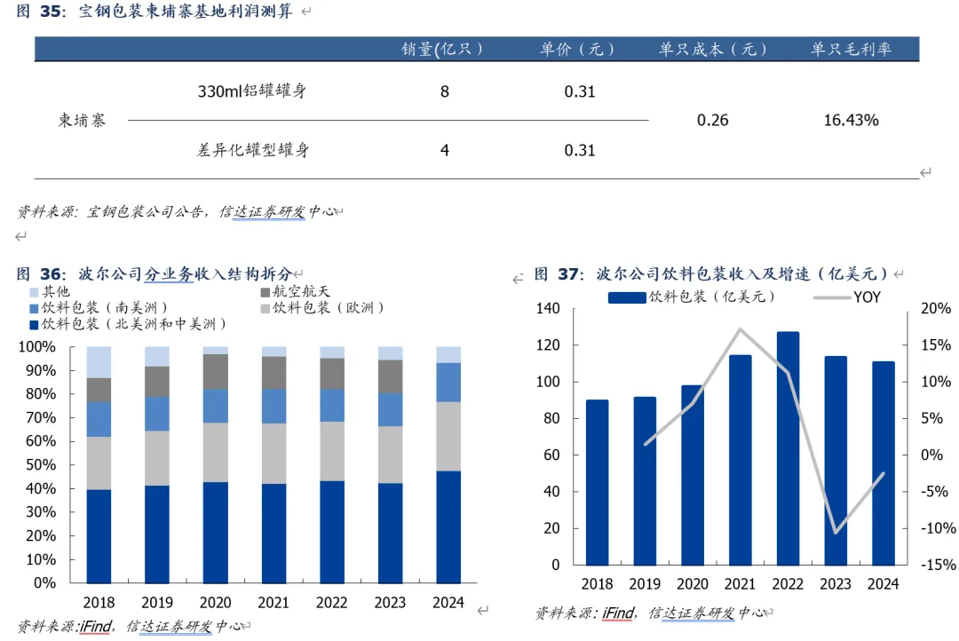 海外成熟公司盈利优异,出海龙头盈利中枢攀升可期。2024年波尔饮料包装收入110.4亿美元(收入占比超90%)、近年毛利率、净利率中枢分别在20%、5%左右,ROE约20%;而国内金属包装龙头ROE位于4-13%区间,对比波尔有较大改善空间。我们认为,波尔盈利优异主要系海外金属包装企业议价能力更优、产品超额定价带来超额利润空间。根据宝钢包装柬埔寨基地测算,其两片罐单只毛利率有望高达16%+(25H1宝钢包装金属饮料罐毛利率仅为7.2%)。未来伴随中国金属包装龙头加速出海,利润结构持续改善,盈利中枢有望向上。