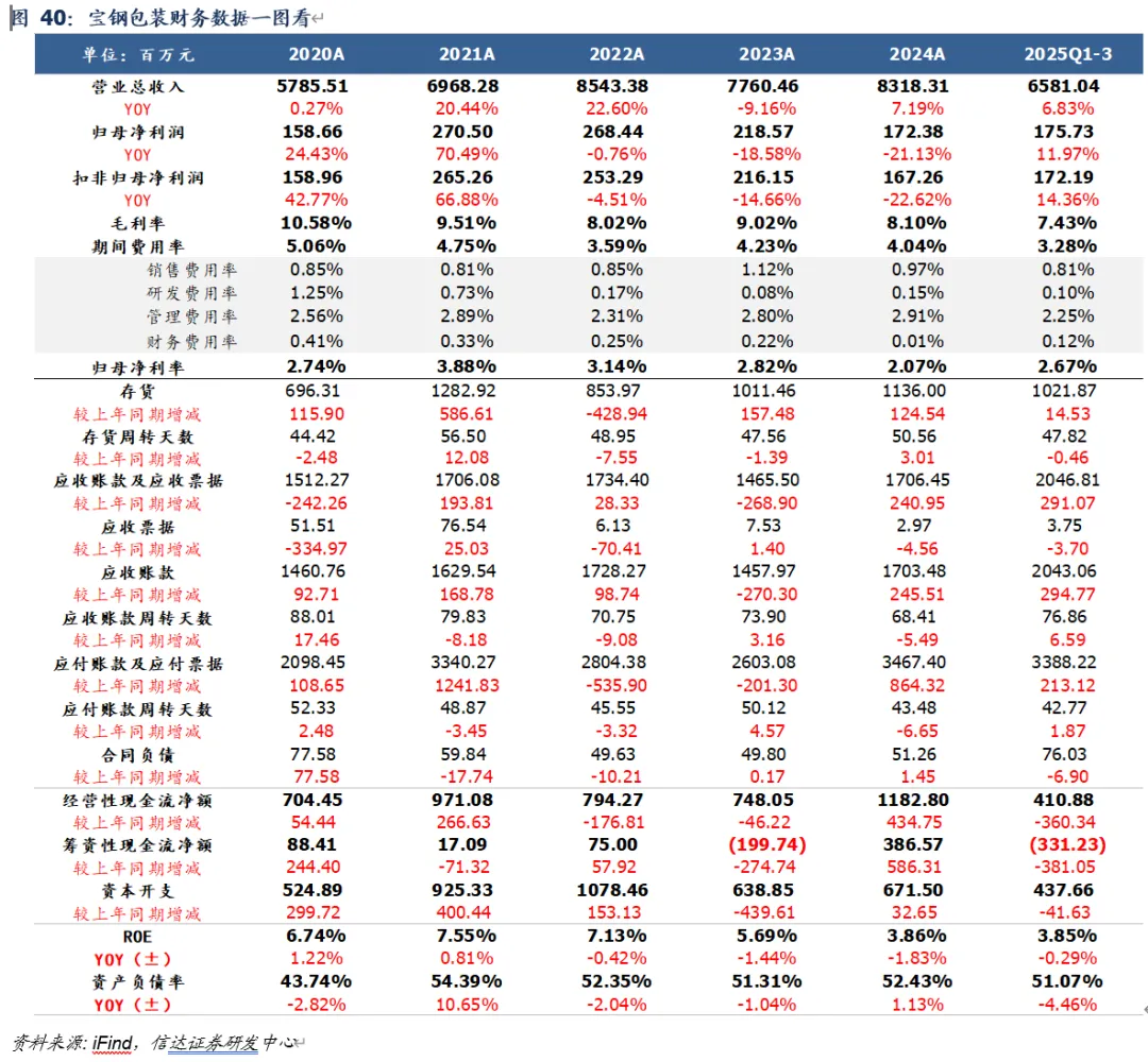 客户&产品矩阵多元,协同优势有望持续放大。公司核心业务是为食品饮料等快消品客户提供综合包装解决方案,并拓展食品深加工。客户囊括红牛、战马、东鹏特饮、百威、青岛啤酒、燕京啤酒、可口可乐、百事可乐、飞鹤、伊利、蒙牛、露露、旺旺、宝洁、蓝月亮等全国领先品牌。2020-2024年公司营业收入从105.61亿元增长至136.73亿元(CAGR为6.7%),归母净利润从7.1亿元增长至7.9亿元(CAGR为2.8%);25Q1-3收入/归母净利润同比分别+69.0%/+41.4%,表现优异主要系25年1月并表中粮包装,进一步巩固公司领先地位,并切入钢桶和塑胶包装等优质业务领域。根据上文测算,公司两片罐产能(含中粮)约276亿罐、三片罐产能约95亿罐,且未来在海外有明确两片产能规划,未来成长动能充沛。