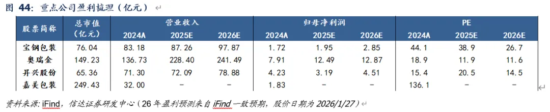 3)奥瑞金:公司25年起加速海外扩张步伐,8月宣布1)收购沙特波尔66%股权(按照26年1月25日汇率,沙特波尔24年收入/利润分别约7.5/0.5亿元)、2)拟在泰国/哈萨克斯坦分别建设7/9亿罐二片罐产能,公司预计26-27年逐步落地。