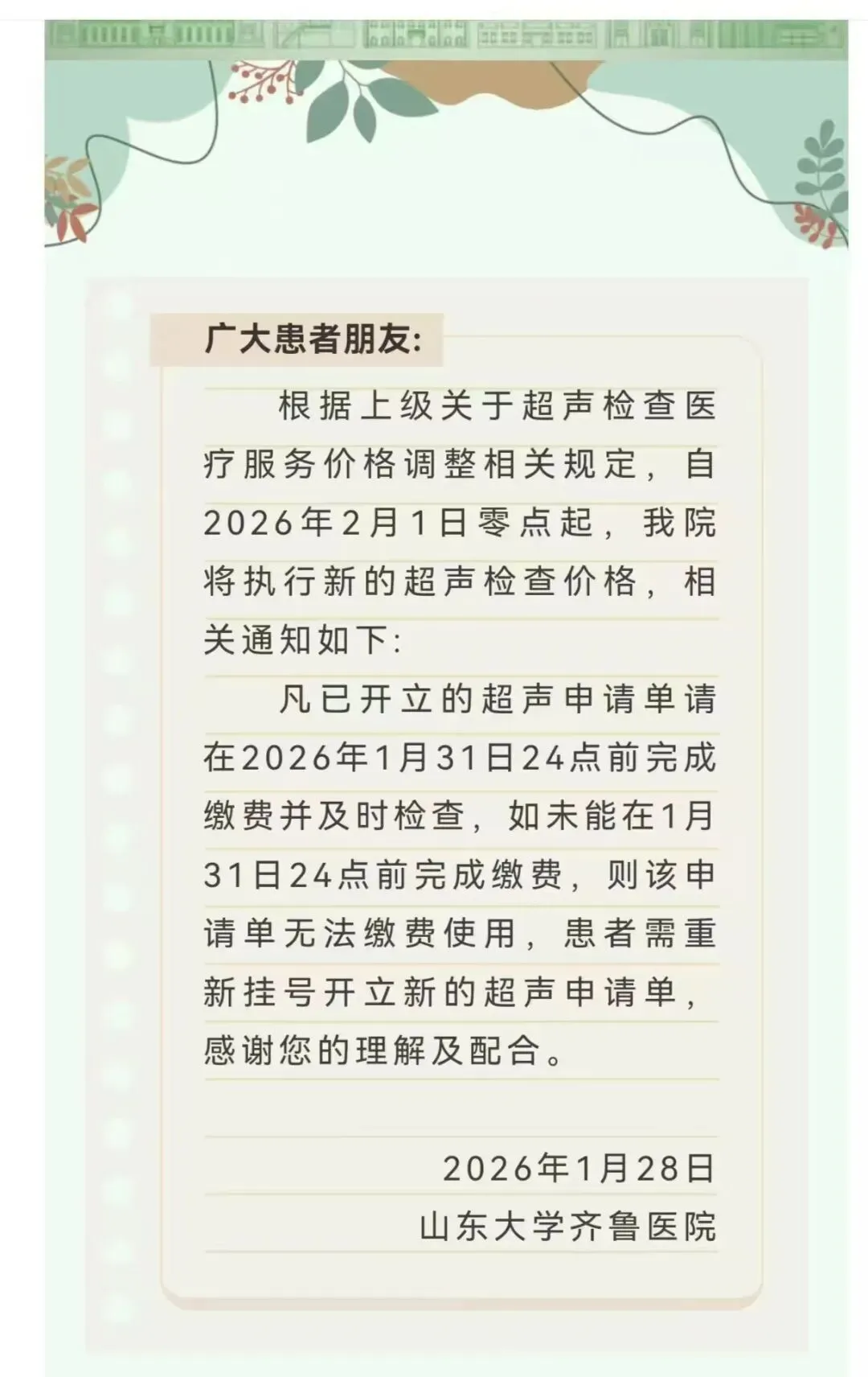 通知!齐鲁医院和山东省立医院超声价格调整~