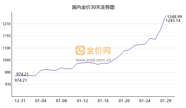 今日国内金价上涨,现价1243.00 元/克,上涨6.88%,今日开盘价1180.44,最高价1248.99,最低价1177.25。