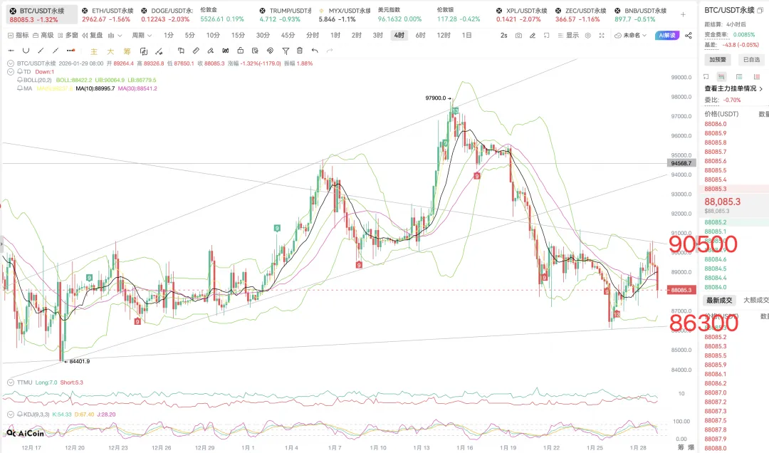 技术面日线布林带开口,昨日收取一根十字,反转信号看空,插针上探之后目前回落,今日如收取一阴,明天将继续看空,上方关注中轨和MA30在91000附近交叉形成的压制,反弹高位任意做空,大趋势交易依旧以反弹高位做空为主。4小时目前连续收取4根阴柱,下破中轨处于中下轨区间运行,目前趋势继续看空,关注下轨支撑86500附近。2小时目前支撑于下轨87500有所反弹,处于短期支撑位附近,预计短期BTC会有一波反弹空间,但上方空间不大,关注中轨89000附近压制,操作继续高空为主。综上,BTC日内操作以反弹高位继续做空为主。