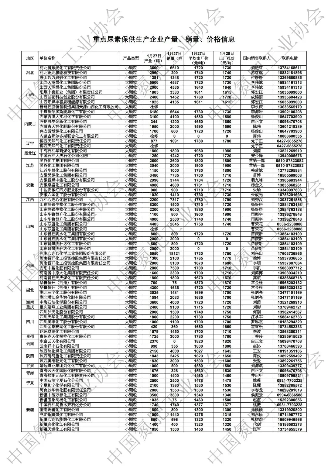 自中国氮肥工业协会发布“加强行业自律 让利与农”的倡议以来,得到了众多企业的响应。现将1月26日各重点企业的尿素产量、销量、价格情况向社会公布,有需要购买尿素的企业可以与这些企业联系,如发现有企业惜售、价格与发布信息不符的,可与氮肥协会联系。联系电话:010-82032100,邮箱