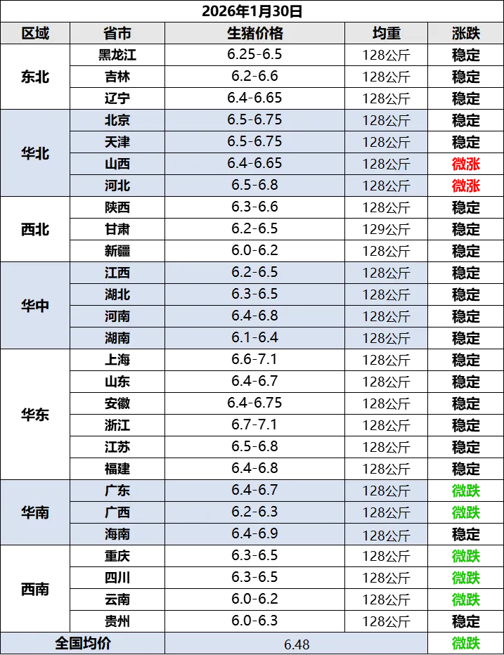 根据统计的猪价,计算出2026年1月29日全国平均猪价为每斤6.33元,比昨天下跌0.05元,跌幅为0.78%,连续4天下跌,累计下跌0.18元,为近17天最低价。