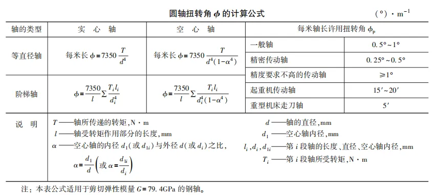 轴的扭转刚度校核是计算轴在工作时的扭转变形量,是用每米轴长的扭转角 ϕ 度量的。轴的扭转变形会影响机器的性能和工作精度,如内燃机凸轮轴的扭转角过大,会影响气门的正确启闭时间;龙门式起重机运行机构传动轴的扭转角会影响驱动轮的同步性;对有发生扭转振动危险的轴以及操纵系统中的轴,都需具有较大的扭转刚度。对传动精度有严格要求的机床(如齿轮机床、 螺纹机床、 刻线机等),轴的过大的扭转变形会严重影响机床的工作精度。但对于一般机器, 轴的扭转刚度不是主要考虑的因素。