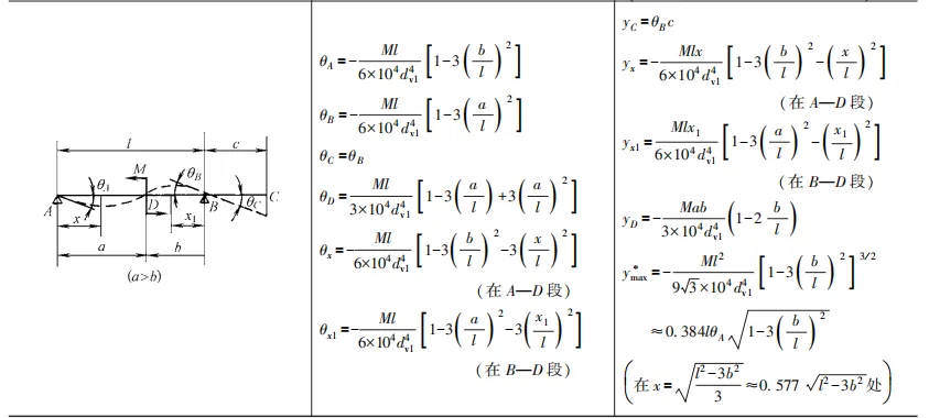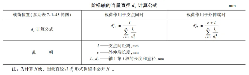 等直径轴的挠度和偏转角一般按双支点梁计算。对于阶梯轴,可近似按当量直径为dv 的等直径轴计算。按当量直径法计算阶梯轴的挠度 y 与偏转角 θ 时,误差可能达到+20%。 所以对于十分重要的轴应采用更准确的计算法。