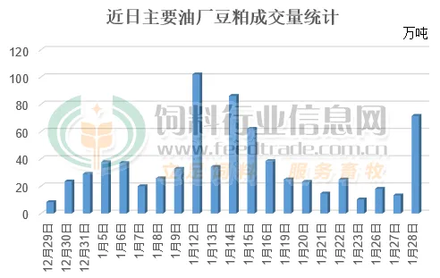 受国内养殖需求旺季期间畜禽养殖的刚性需求较大影响,饲料养殖企业在春节之前拿货的需求较大,油厂豆粕提货需求量仍大于油厂压榨大豆产生的豆粕数量后,油厂豆粕库存继续处于减少的趋势。据国家粮食和物资储备数据中心监测显示,截止1月23日,全国主要油厂豆粕库存87万吨,已经连续第三周出现下降,减少27万吨,预计节前拿货较多油厂库存将持续下降,增强油厂对豆粕的挺价动力。