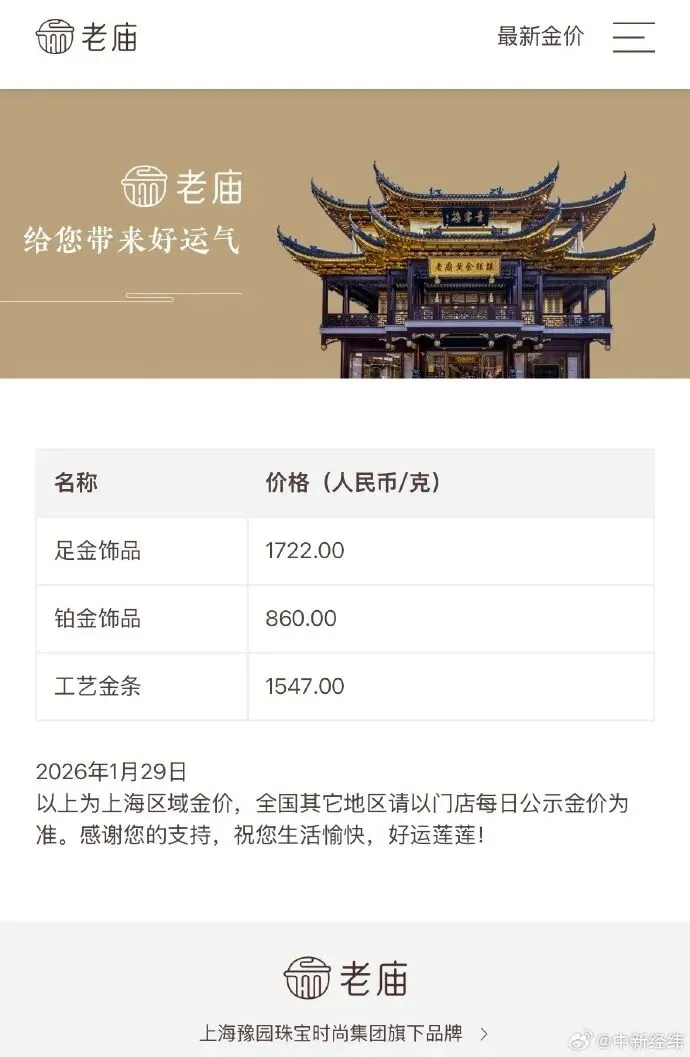 北京时间28日,现货黄金突破5500美元,COMEX黄金期货盘中一度突破5600美元,日内涨超5%。国内品牌金饰价格跟随上调,截至发稿,@中新经纬 查询到,周生生足金饰品报1708元/克,较前一日1614元/克涨94元。老庙黄金足金饰品报1722元/克,较前一日1618元/克涨104元。