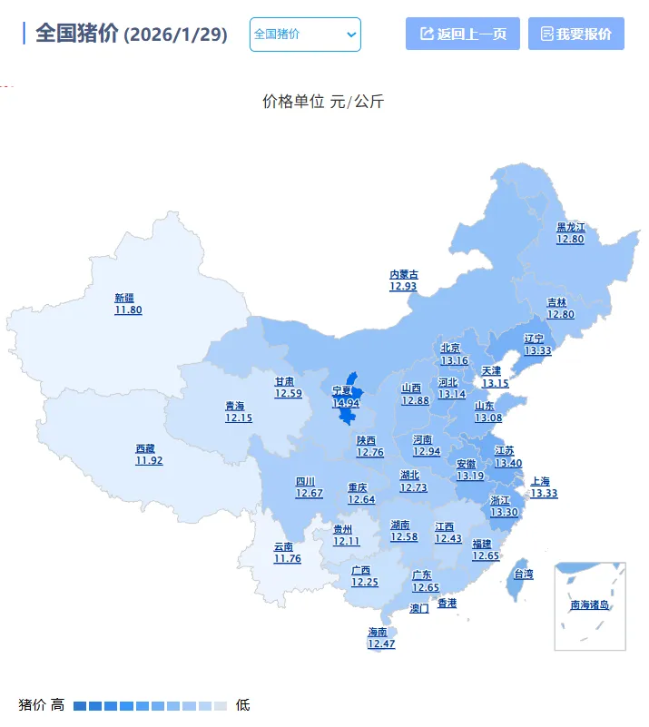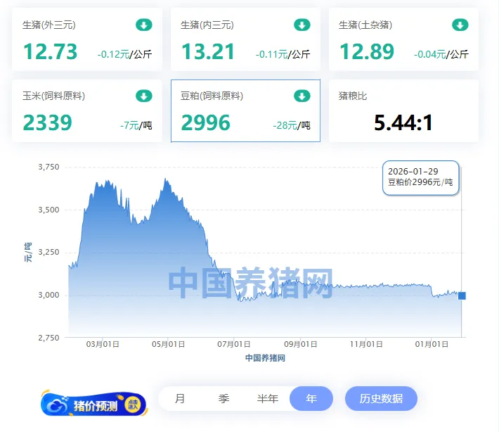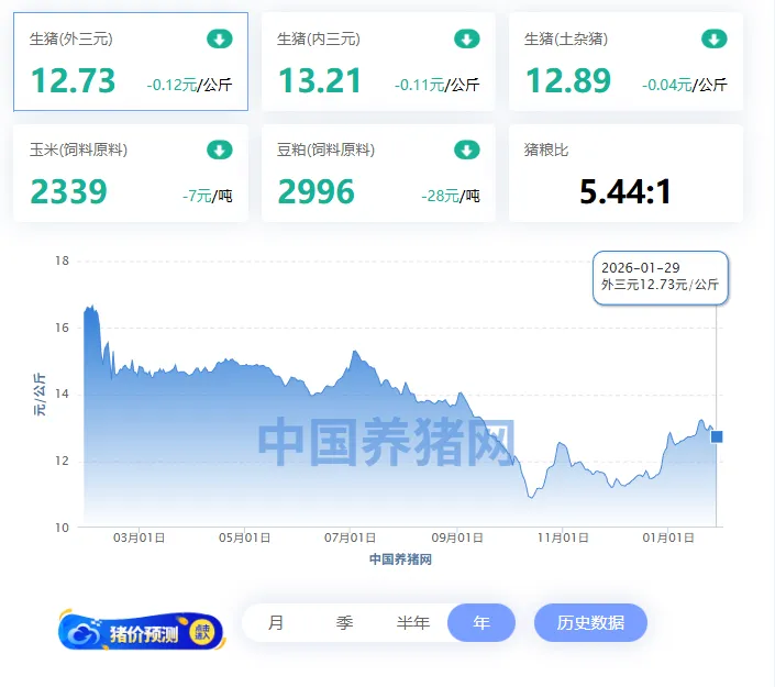 2026年01月29日(星期四),中国养猪网“养猪数据中心”监测的生猪价格以及饲料原料价格明细如下: