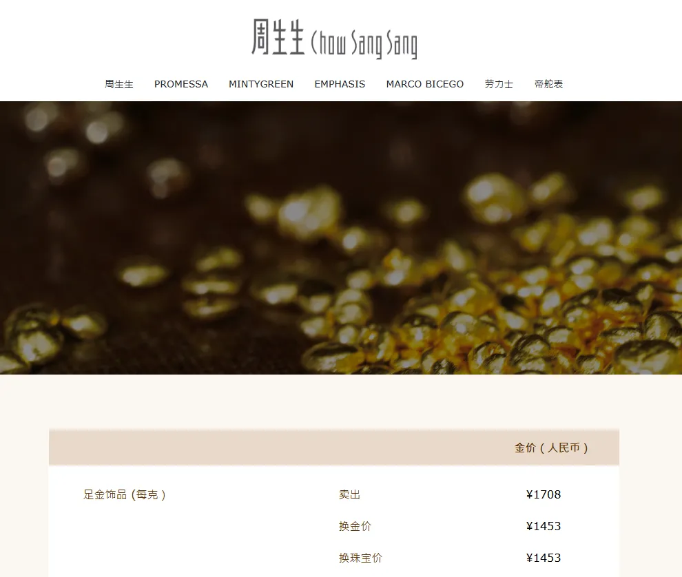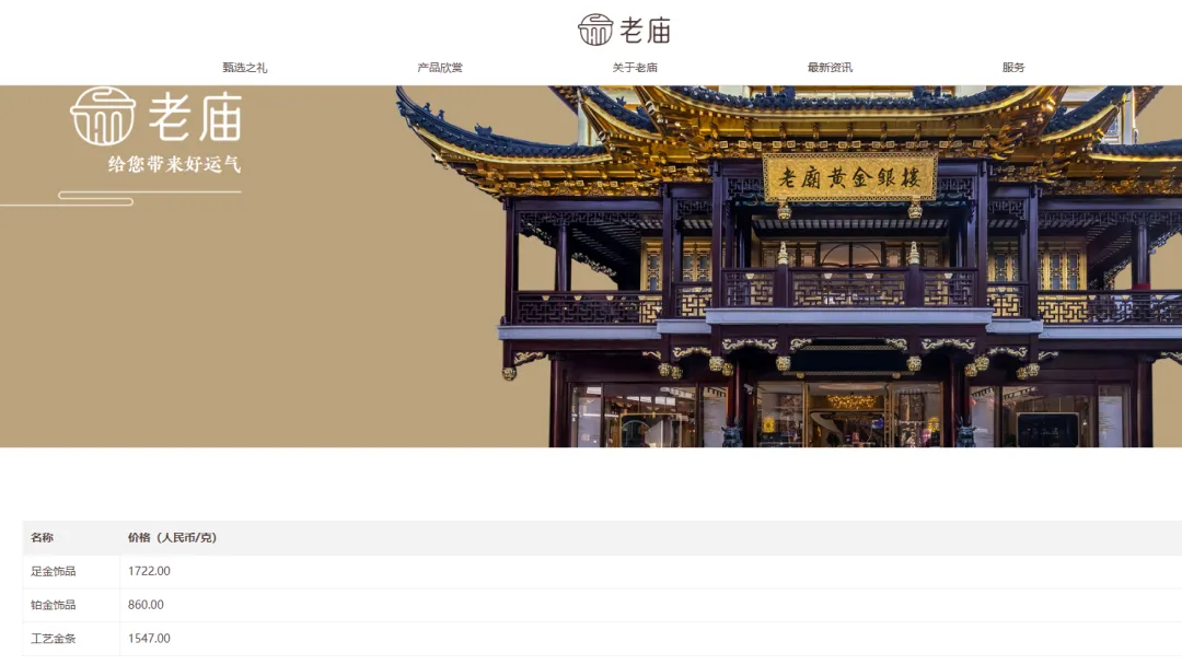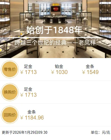 周大福报价1706元/克,上涨88元/克;老庙黄金报价1722元/克,上涨104元/克;周生生报价1708元/克,上涨94元/克;老凤祥为1713元/克,上涨93元/克。