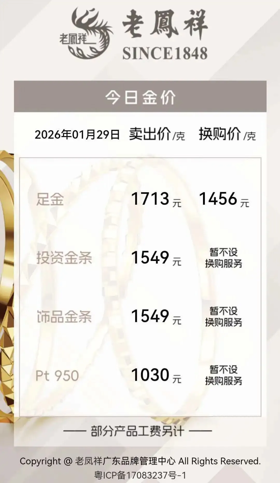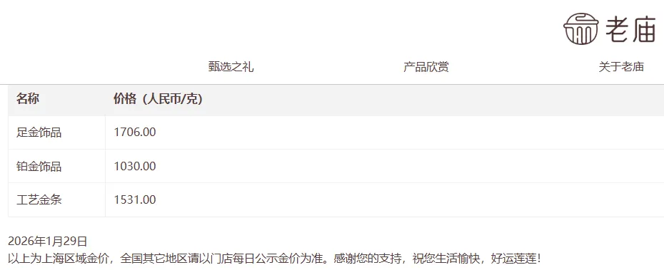 金饰克价一夜大涨破1700元:老庙黄金报1722元/克、老凤祥报1713元/克、周大福报1706元/克