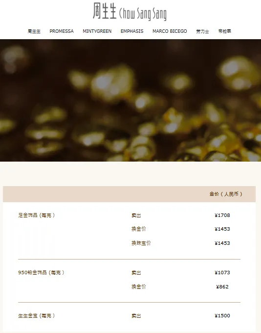 周生生报价1708元/克,单日上涨94元。