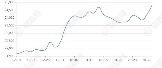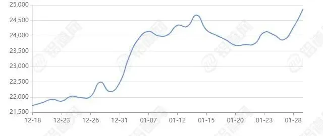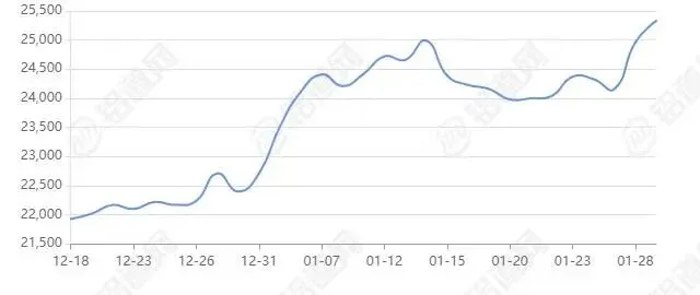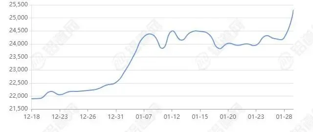2026年01月29日上海期货行情价25305涨跌+545,最低25155,最高25495,前三日均价24251,前五日均价24143。