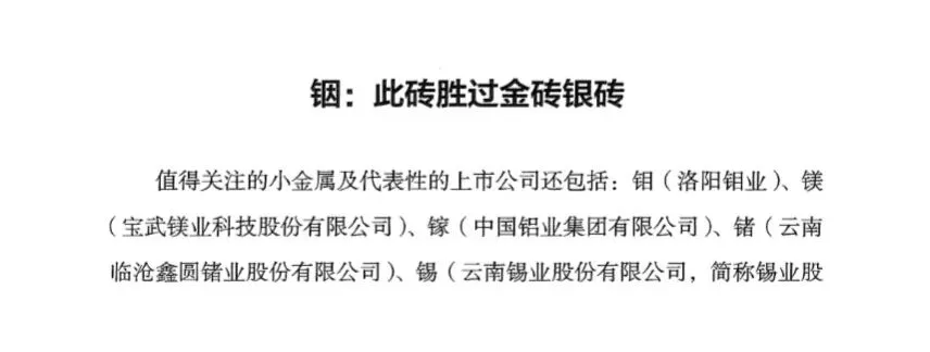 直接重点关注:中钨高新、厦门钨业(钨),北方稀土、中国稀土(稀土),湖南黄金(锑)等龙头公司。值得关注的小金属及代表性的上市公司还包括:钼(洛阳钼业)、镁(宝武镁业科技股份有限公司)、镓(中国铝业集团有限公司)、锗(云南临沧鑫圆锗业股份有限公司)、锡(云南锡业股份有限公司,简称锡业股份)、钮(宁夏东方钽业股份有限公司)、铟(株洲冶炼集团股份有限公司)等。(详情见书中p321)