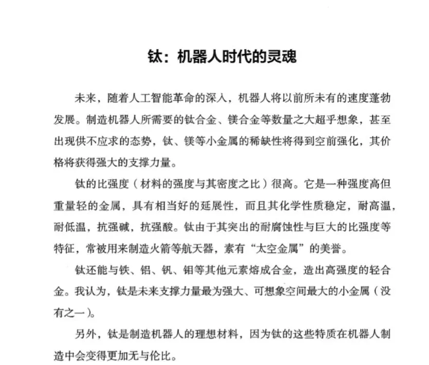 “制造机器人所需要的钛合金、镁合金会出现供不应求的态势,” 时寒冰在书中预判。随着人工智能和机器人产业的爆发式增长,钛的需求将迎来新一轮增长。