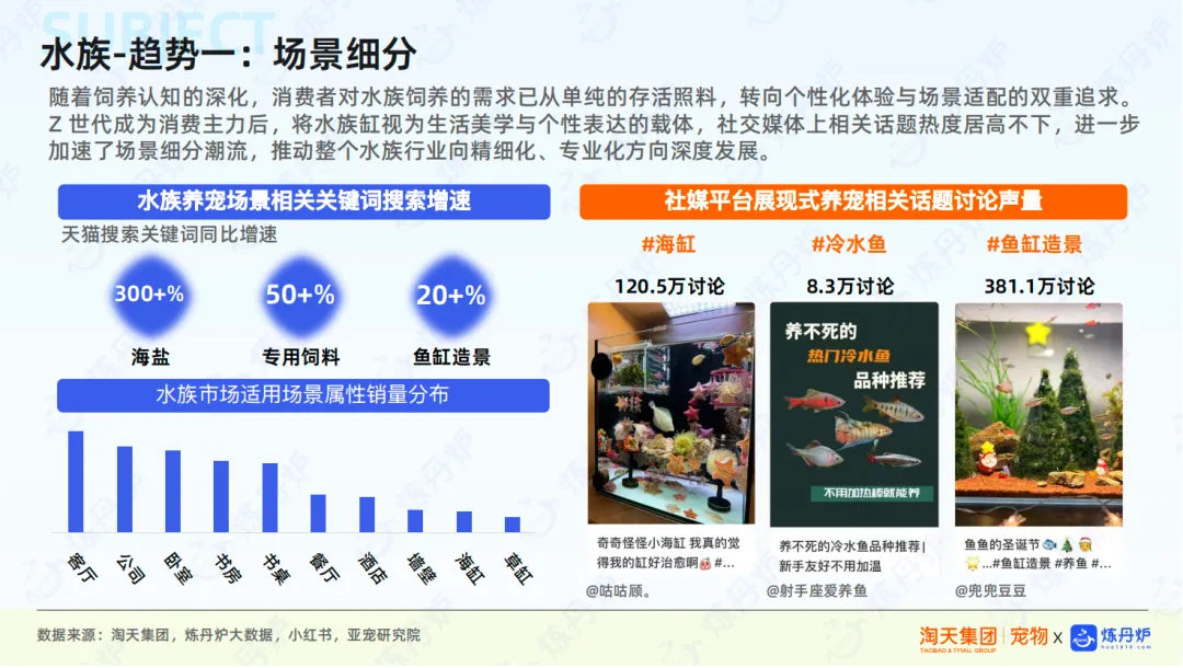 随着饲养认知的深化,消费者对水族饲养的需求已从单纯的存活照料,转向个性化体验与场景适配的双重追求。Z 世代成为消费主力后,将水族缸视为生活美学与个性表达的载体,社交媒体上相关话题热度居高不下,进一步加速了场景细分潮流,推动整个水族行业向精细化、专业化方向深度发展。