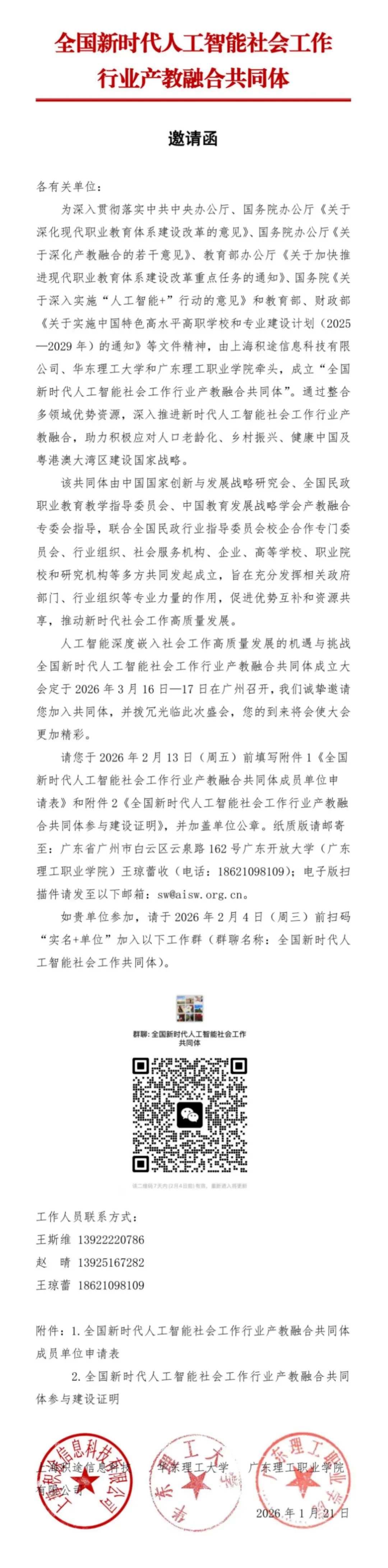 人工智能深度嵌入社会工作高质量发展的机遇与挑战全国新时代人工智能社会工作行业产教融合共同体成立大会定于2026年3月16日-17日在广州召开,我们诚挚邀请您加入共同体,并拨冗光临此次盛会,您的到来将会使大会更加精彩。