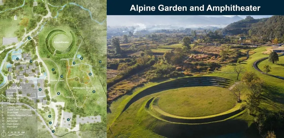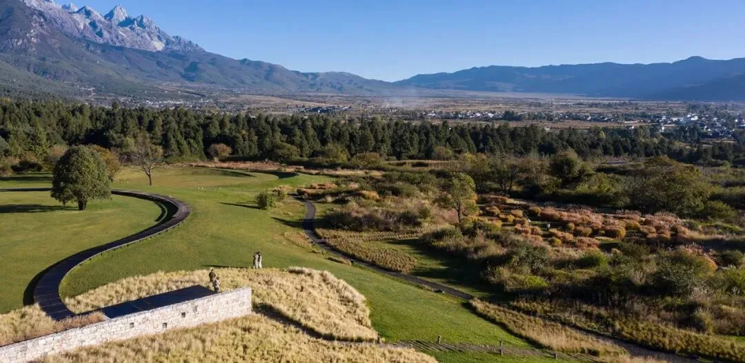该项目位于玉龙雪山脚下,距离这座联合国教科文组织认证的自然遗产地仅5公里。项目地处泛喜马拉雅区域,占地6公顷,致力于打造一个可以自我维持的生态系统,同时展现高山植物的自然之美。园区内还设计了一套高效的雨水管理系统,有效保护世界文化遗产白沙古镇免受洪涝威胁。
