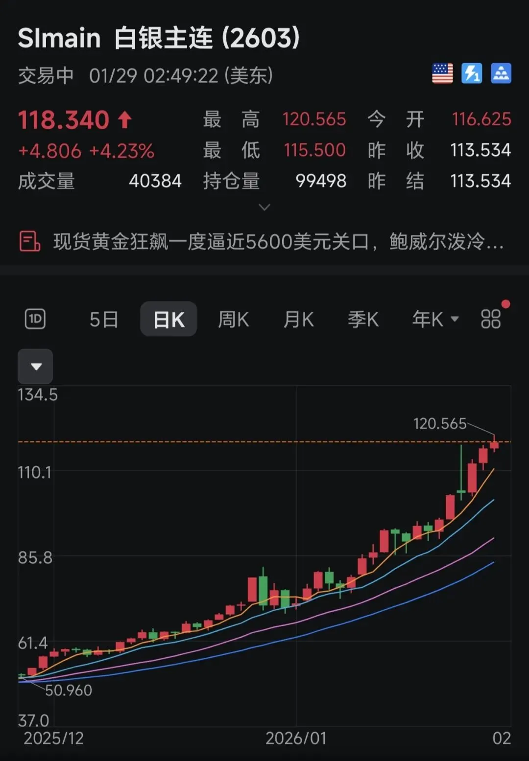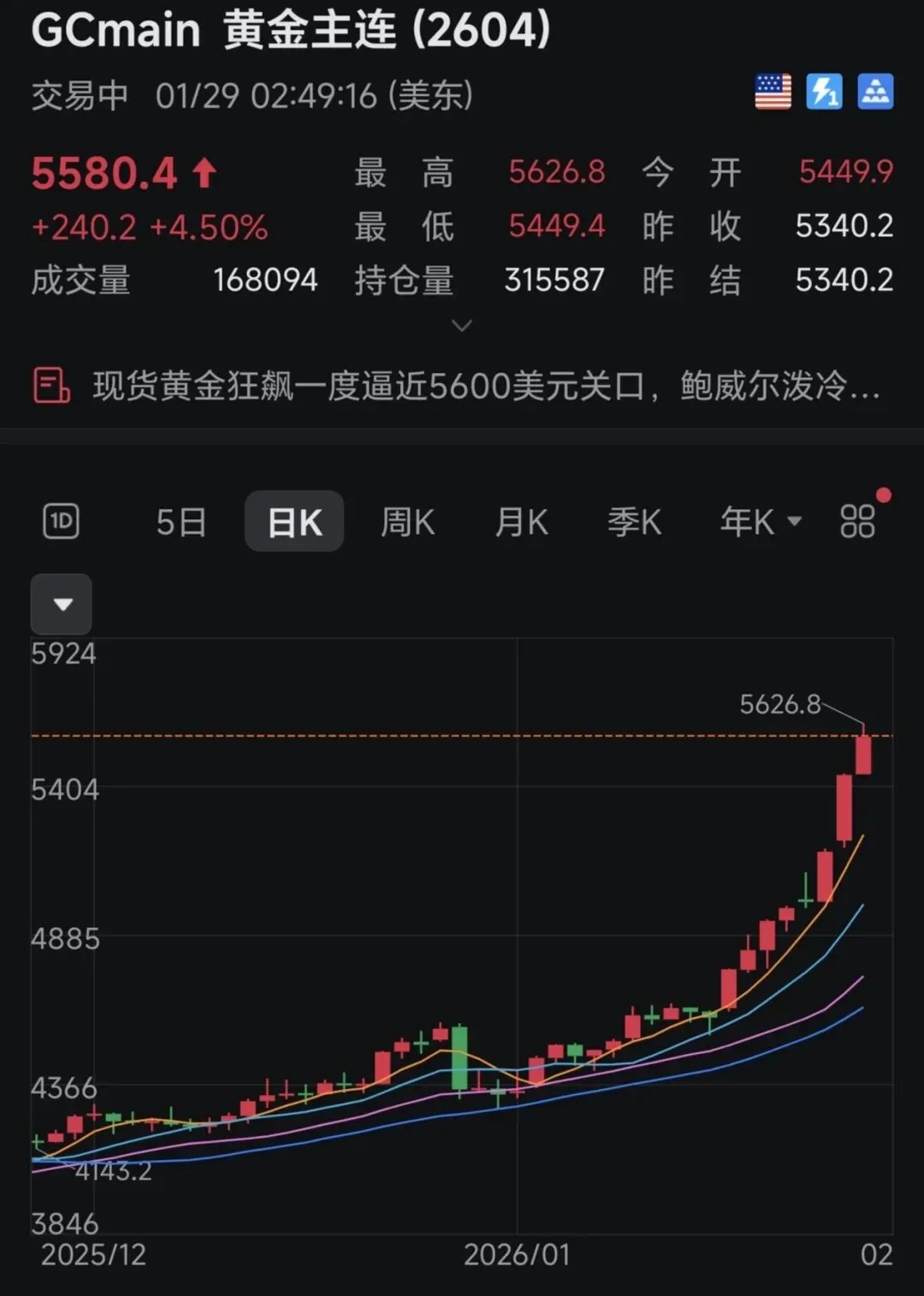 今天(1月29日)亚洲交易时段,国际金价继续狂飙。伦敦现货黄金最高触及5598美元/盎司,COMEX黄金期货一度突破5626美元,双双刷新历史纪录。白银也不甘示弱,现货白银最高冲至119.24美元,再创历史新高。从5000美元到5500美元,黄金只用了三个交易日,这种涨法在历史上都罕见。