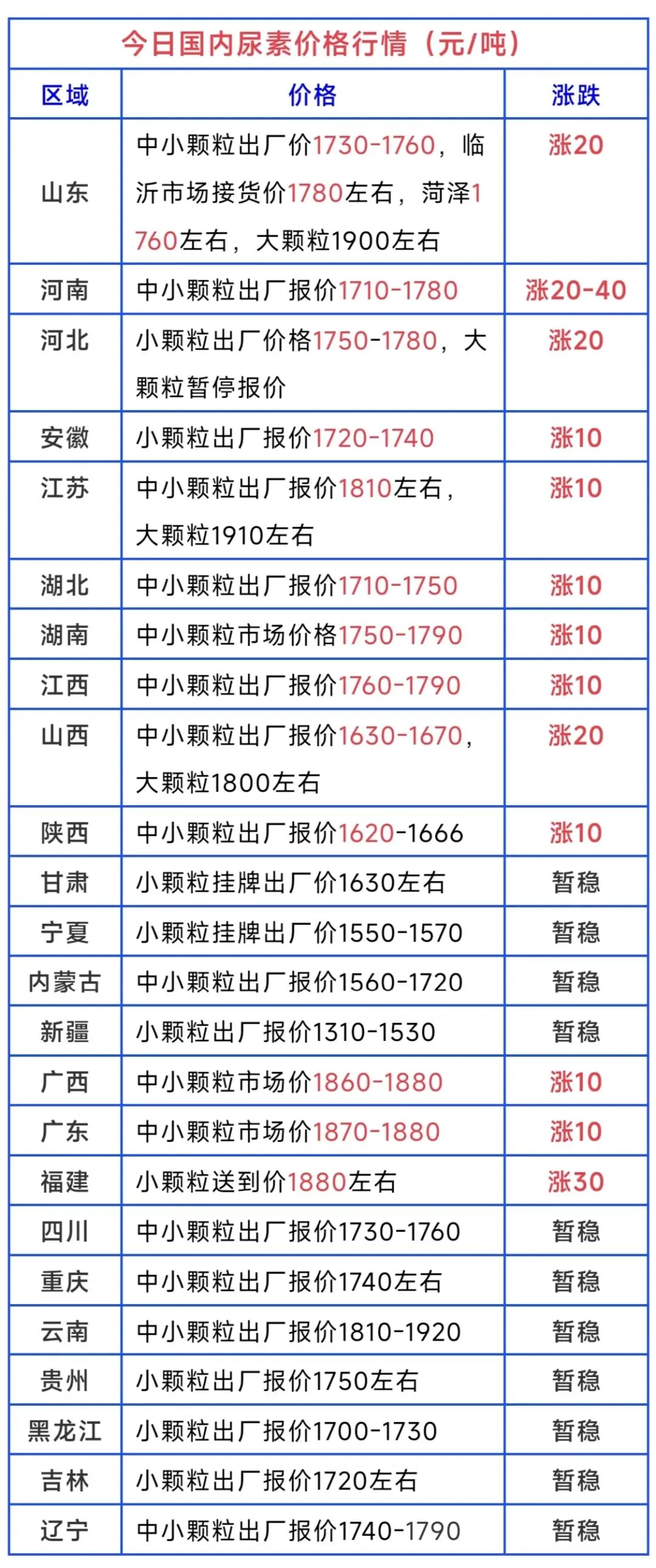 2026年1月29日,国内尿素现货价格继续上行,出厂报价出现大范围上涨,上涨幅度在10-30元/吨。