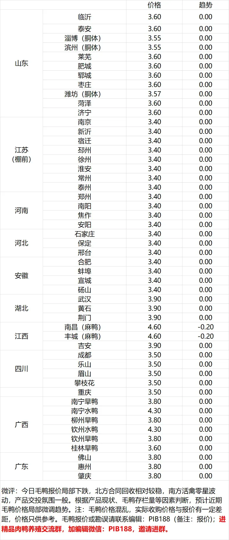 | 微评:鸭苗报价稳定。(注:南方只报当天价格)合同落的较快,补栏情绪逐步谨慎。根据产品、养殖成本及鸭苗现状分析,预计近期鸭苗价格呈稳中微调趋势。种蛋报价稳定。温馨提示:该价格为主流厂家报价,实际销售价格以成交价格为准,价 |